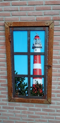 Ameländer Leuchtturm im selbst gestalteten Fenster in unserem Wintergarten.
