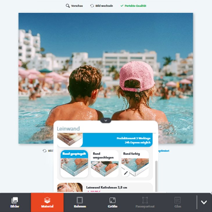 Achte auf eine Auflösung von mindestens 150 dpi. Im Konfigurator siehst Du, ob die Bildauflösung groß genug für Deine gewählte Bildgröße ist. Wähle die Rand-Optionen „gespiegelt“ oder “farbig”, damit das komplette Motiv sichtbar bleibt.