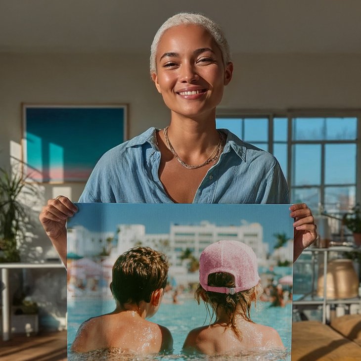 • Quadratische Formate wie 20×20 cm oder 30×30 cm sind ideal für kleine Flächen wie den Flur, das Regal oder den Schreibtisch. Sie eignen sich besonders gut für Detailaufnahmen, Collagen, Typografie oder als persönliche Geschenkidee.