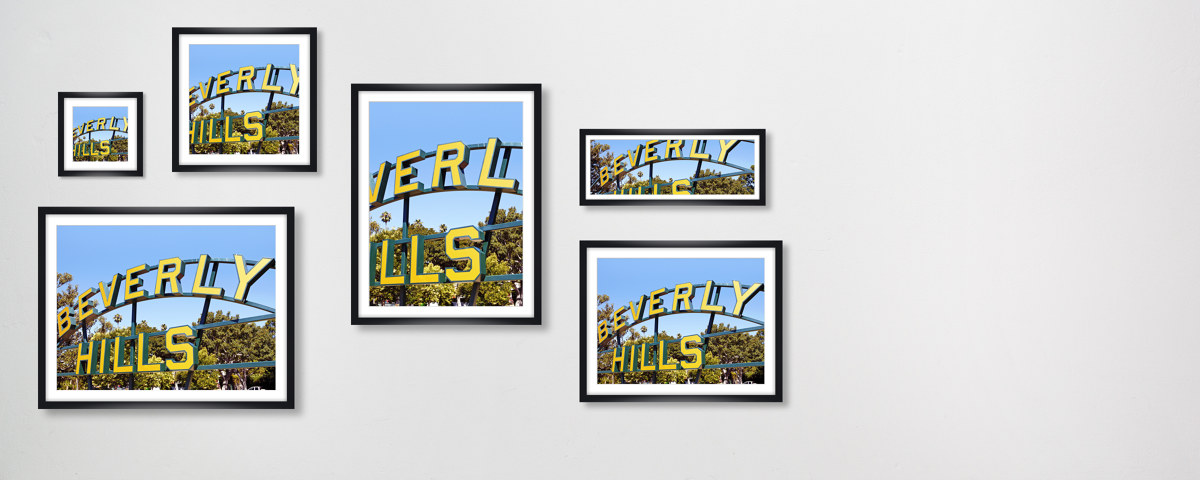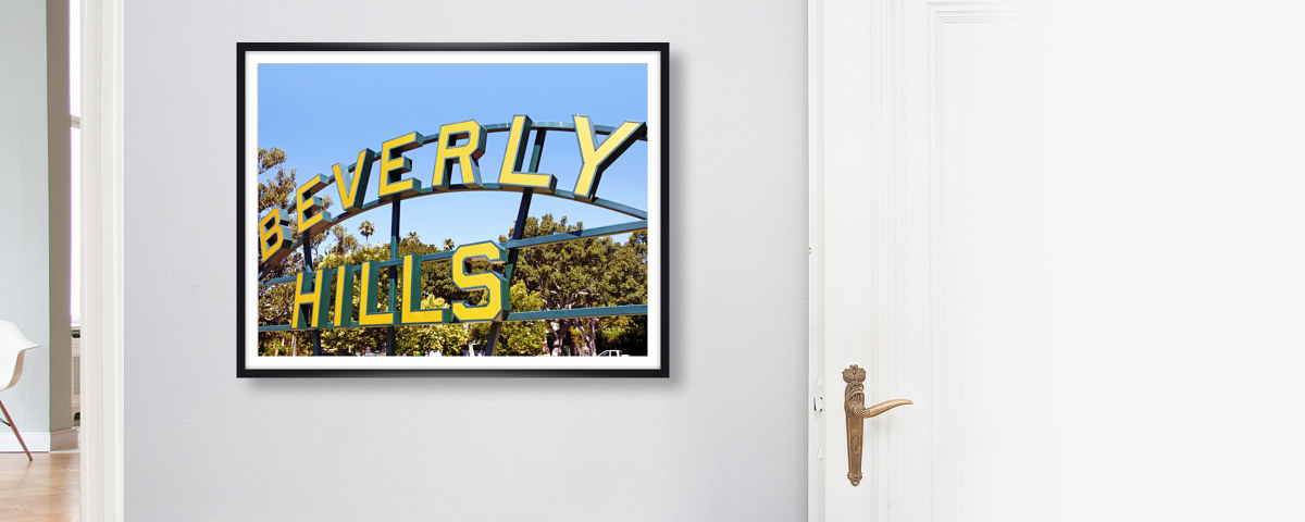 Beverly Hills Sign als Hahnemühle Fineart Print. Entweder pur als Print, im Rahmen auch mit Passepartout oder kaschiert auf Alu-Dibond. Das handgeschöpfte Papier zeigt Nuancen Ihres neuen Lieblingsbilds, die auf anderen Materialien im Verborgenen bleiben.