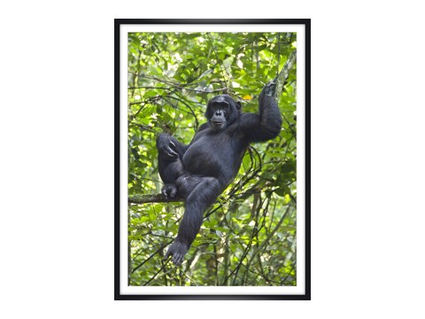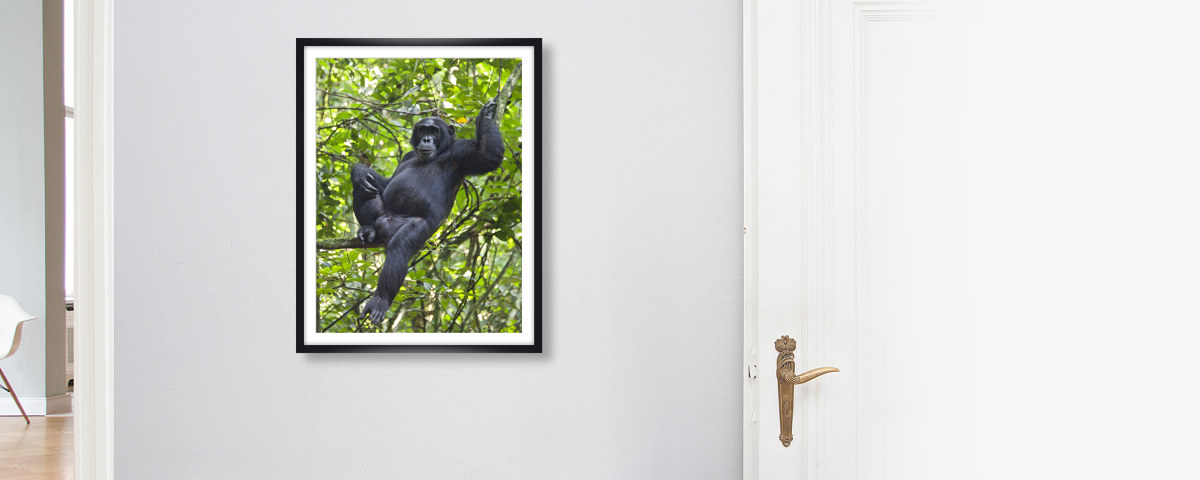 Chimpanzee im weißen Holzrahmen. Setzen Sie Ihr neues Lieblingsmotiv dezent in Szene - wahlweise mit und ohne Passepartout.