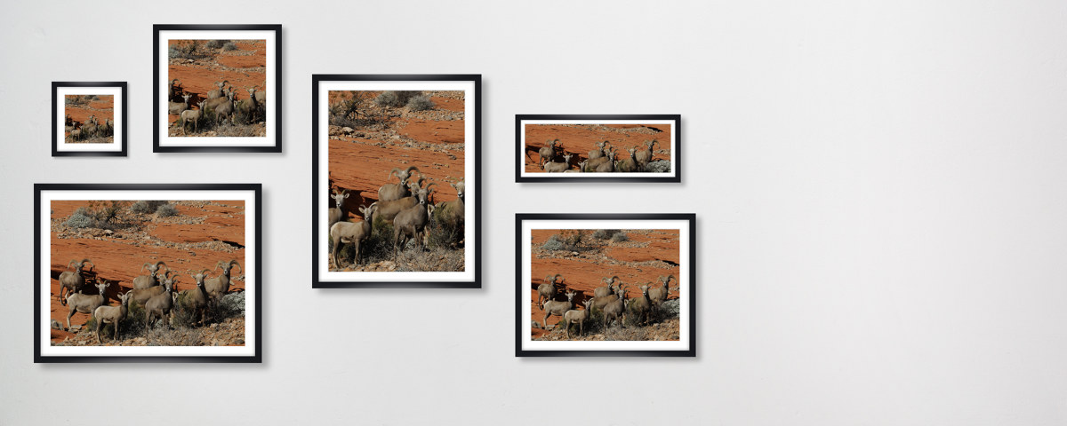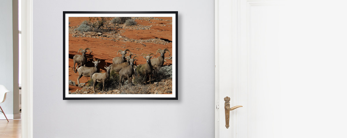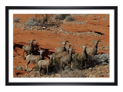 Desert bighorn sheep herd im weißen Holzrahmen. Setzen Sie Ihr neues Lieblingsmotiv dezent in Szene - wahlweise mit und ohne Passepartout.