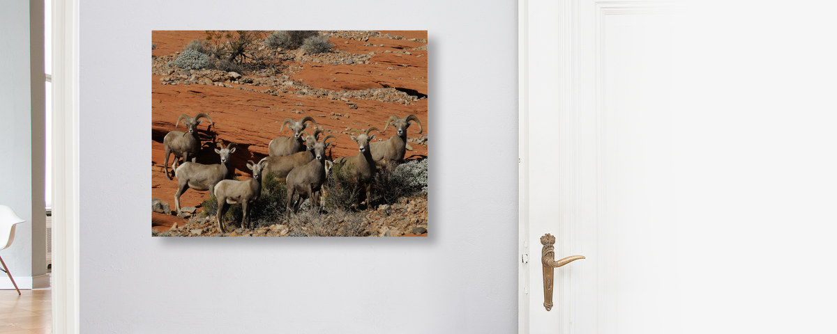 Desert bighorn sheep herd auf Leinwand im Format Ihrer Wahl. Mit gespiegelten oder umgeschlagenem Rand bzw. der Randfarbe Ihrer Wahl. Mit 2,5 oder 3,8 cm starken Perfect Frame Rahmen.