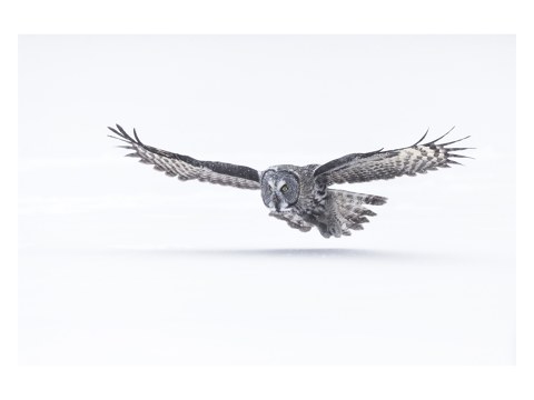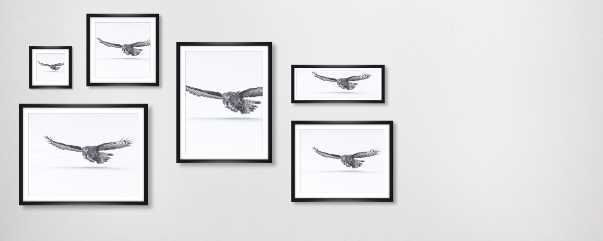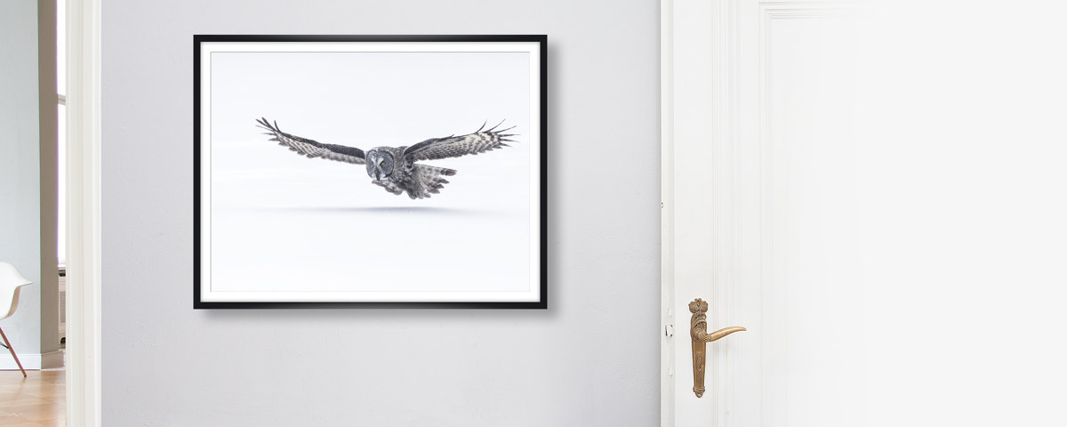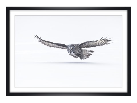 Eule im Anflug im weißen Holzrahmen. Setzen Sie Ihr neues Lieblingsmotiv dezent in Szene - wahlweise mit und ohne Passepartout.