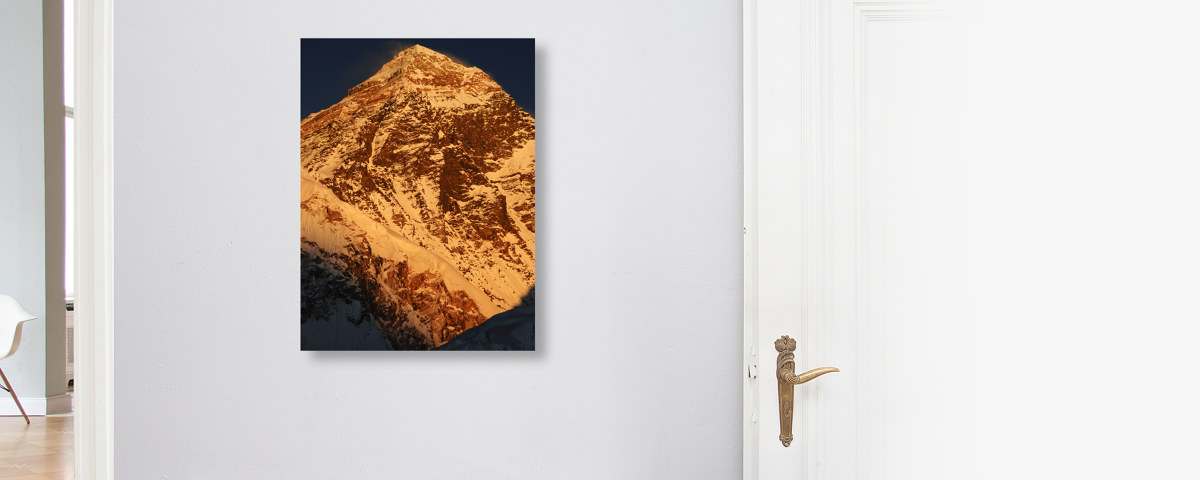 Everest Light auf Leinwand im Format Ihrer Wahl. Mit gespiegelten oder umgeschlagenem Rand bzw. der Randfarbe Ihrer Wahl. Mit 2,5 oder 3,8 cm starken Perfect Frame Rahmen.