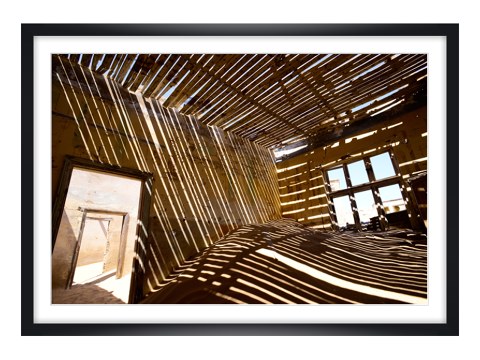 Geisterstadt in Namibia auf Leinwand im Format Ihrer Wahl. Mit gespiegelten oder umgeschlagenem Rand bzw. der Randfarbe Ihrer Wahl. Mit 2,5 oder 3,8 cm starken Perfect Frame Rahmen.