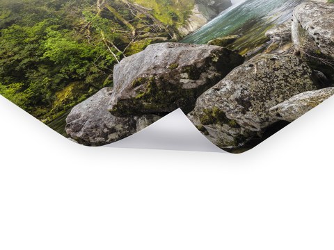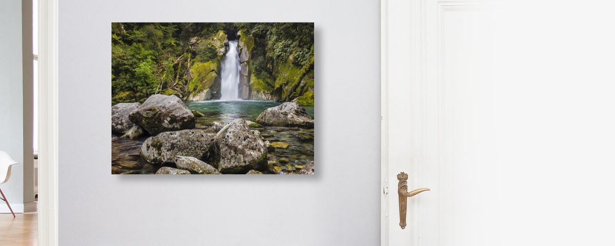 Giant Gate Falls auf Fotopapier gedruckt, hinter Acrylglas (2 mm) kaschiert und mit einer Aluminium-Dibond-Verbundplatte (3 mm) hinterlegt. Die edelste Inszenierung Ihres neuen Motivs als rahmenloses Bild.