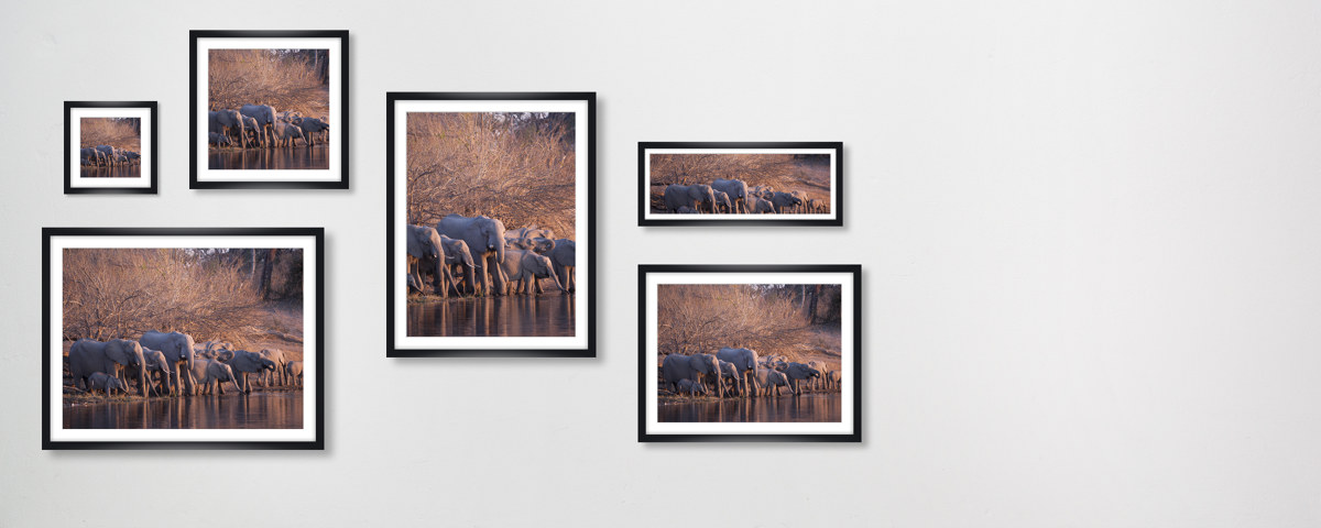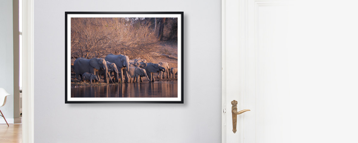 Herd of Elephants als Hahnemühle Fineart Print. Entweder pur als Print, im Rahmen auch mit Passepartout oder kaschiert auf Alu-Dibond. Das handgeschöpfte Papier zeigt Nuancen Ihres neuen Lieblingsbilds, die auf anderen Materialien im Verborgenen bleiben.
