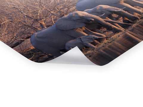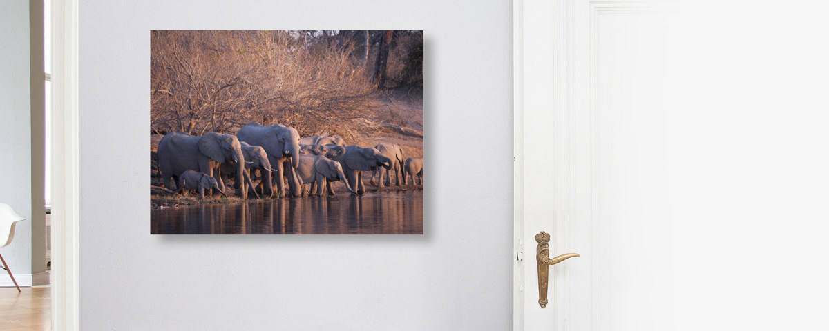 Herd of Elephants auf Fotopapier gedruckt, hinter Acrylglas (2 mm) kaschiert und mit einer Aluminium-Dibond-Verbundplatte (3 mm) hinterlegt. Die edelste Inszenierung Ihres neuen Motivs als rahmenloses Bild.
