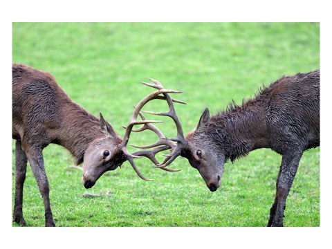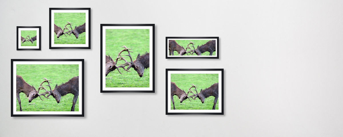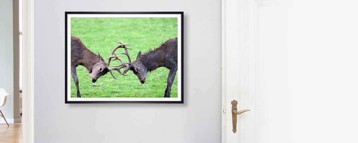 Hirschkampf im weißen Holzrahmen. Setzen Sie Ihr neues Lieblingsmotiv dezent in Szene - wahlweise mit und ohne Passepartout.
