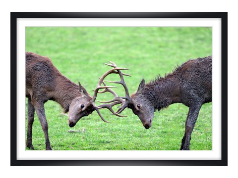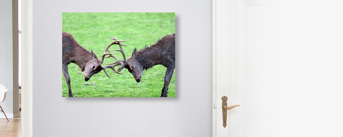 Hirschkampf auf Leinwand im Format Ihrer Wahl. Mit gespiegelten oder umgeschlagenem Rand bzw. der Randfarbe Ihrer Wahl. Mit 2,5 oder 3,8 cm starken Perfect Frame Rahmen.