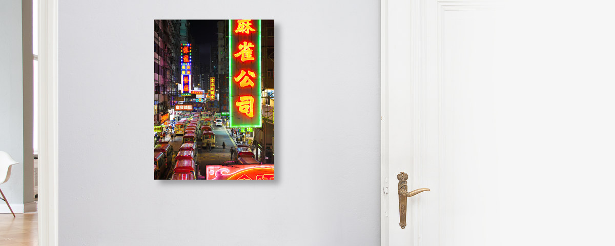Hong Kong auf Leinwand im Format Ihrer Wahl. Mit gespiegelten oder umgeschlagenem Rand bzw. der Randfarbe Ihrer Wahl. Mit 2,5 oder 3,8 cm starken Perfect Frame Rahmen.