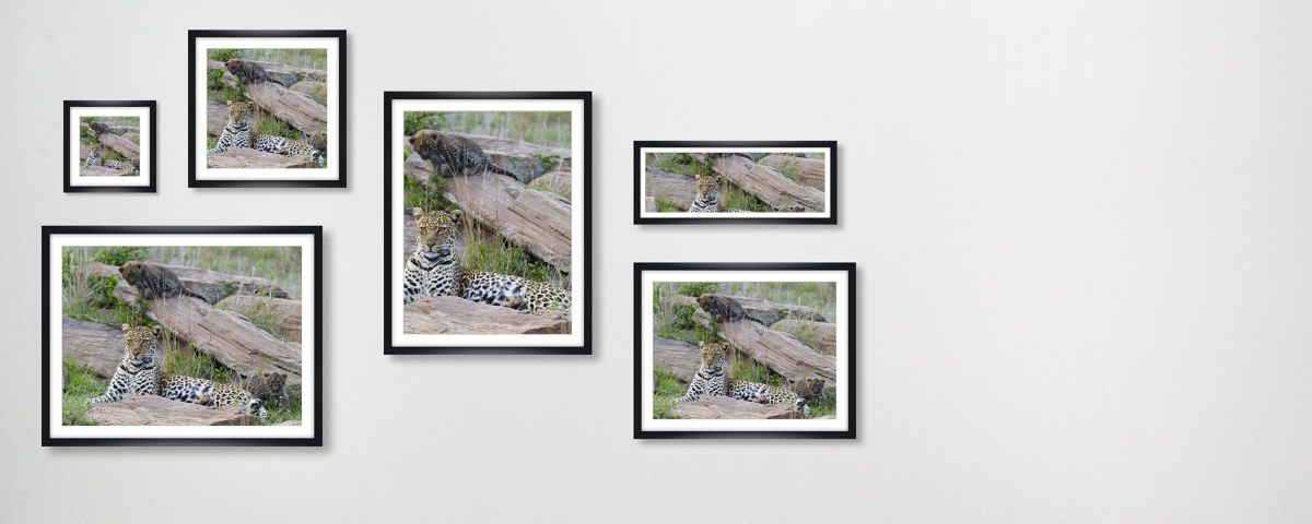 Leopard Mother and Cubs auf Leinwand im Format Ihrer Wahl. Mit gespiegelten oder umgeschlagenem Rand bzw. der Randfarbe Ihrer Wahl. Mit 2,5 oder 3,8 cm starken Perfect Frame Rahmen.
