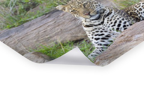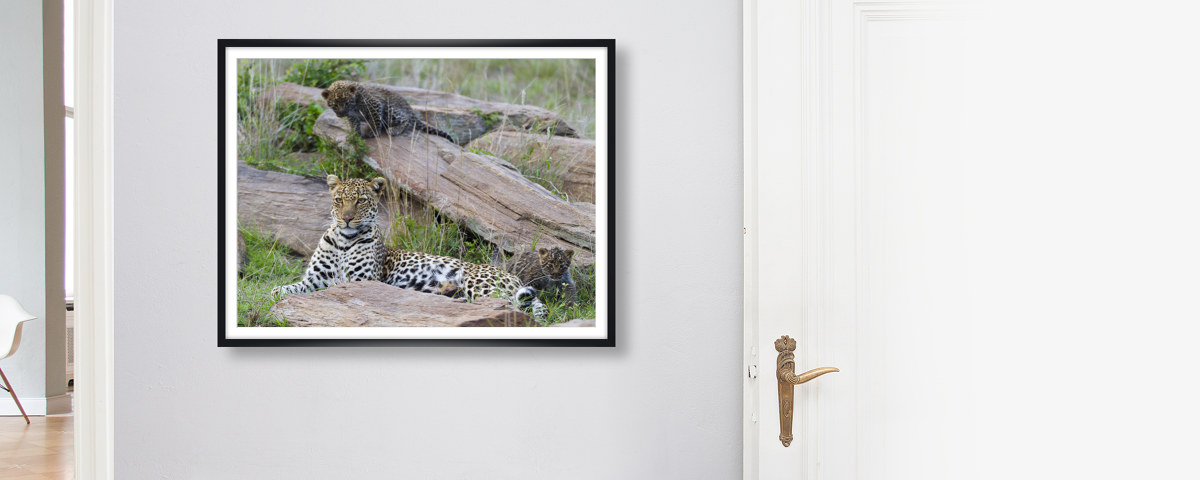 Leopard Mother and Cubs als Hahnemühle Fineart Print. Entweder pur als Print, im Rahmen auch mit Passepartout oder kaschiert auf Alu-Dibond. Das handgeschöpfte Papier zeigt Nuancen Ihres neuen Lieblingsbilds, die auf anderen Materialien im Verborgenen bleiben.
