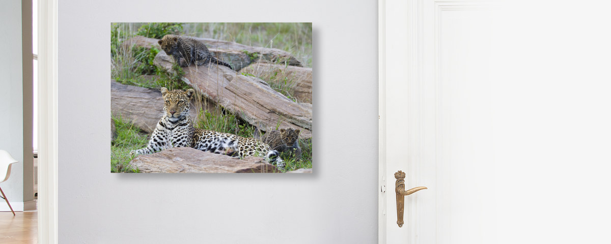 Leopard Mother and Cubs auf Alu-Dibond im Format Ihrer Wahl als Direktdruck, Fineart matt oder glänzend, als Alu Dibond Butlerfinish® oder als edler Alu Dibond Hahnemühle Fineart Print.