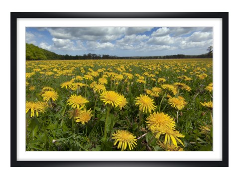 Mass of Dandelions im weißen Holzrahmen. Setzen Sie Ihr neues Lieblingsmotiv dezent in Szene - wahlweise mit und ohne Passepartout.