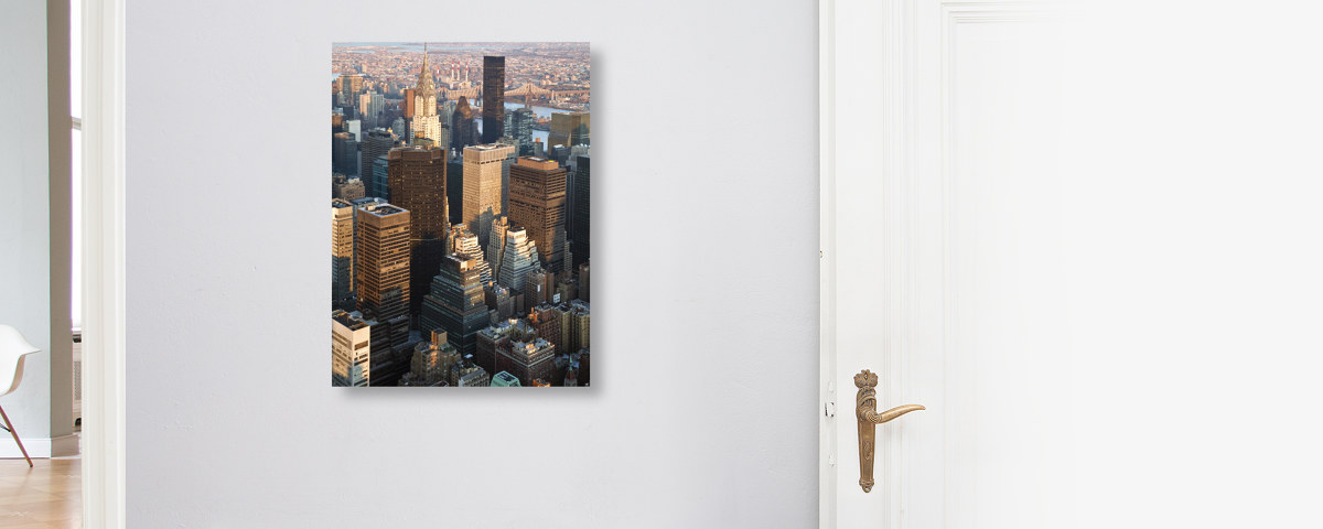 Mid Town Manhattan auf Fotopapier gedruckt, hinter Acrylglas (2 mm) kaschiert und mit einer Aluminium-Dibond-Verbundplatte (3 mm) hinterlegt. Die edelste Inszenierung Ihres neuen Motivs als rahmenloses Bild.