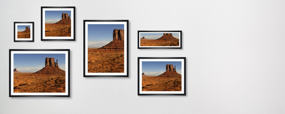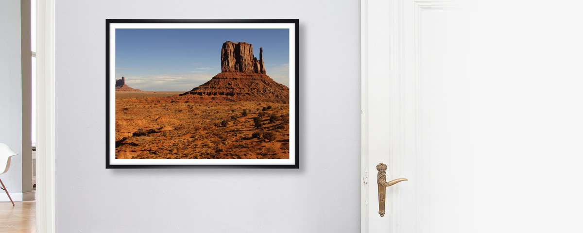 Monument Valley als Hahnemühle Fineart Print. Entweder pur als Print, im Rahmen auch mit Passepartout oder kaschiert auf Alu-Dibond. Das handgeschöpfte Papier zeigt Nuancen Ihres neuen Lieblingsbilds, die auf anderen Materialien im Verborgenen bleiben.
