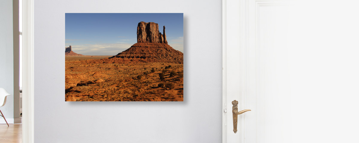 Monument Valley auf Leinwand im Format Ihrer Wahl. Mit gespiegelten oder umgeschlagenem Rand bzw. der Randfarbe Ihrer Wahl. Mit 2,5 oder 3,8 cm starken Perfect Frame Rahmen.