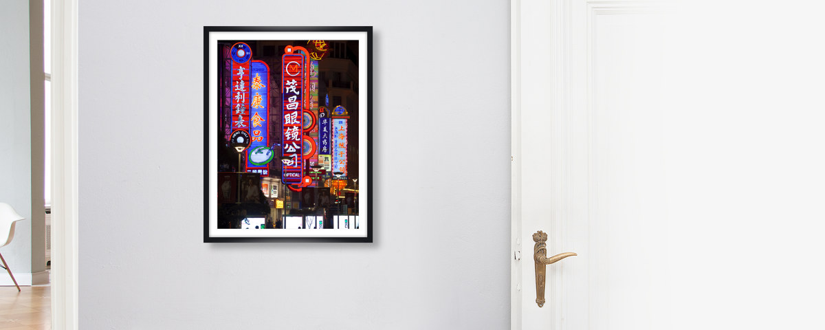 Neon Signs above Shops im weißen Holzrahmen. Setzen Sie Ihr neues Lieblingsmotiv dezent in Szene - wahlweise mit und ohne Passepartout.