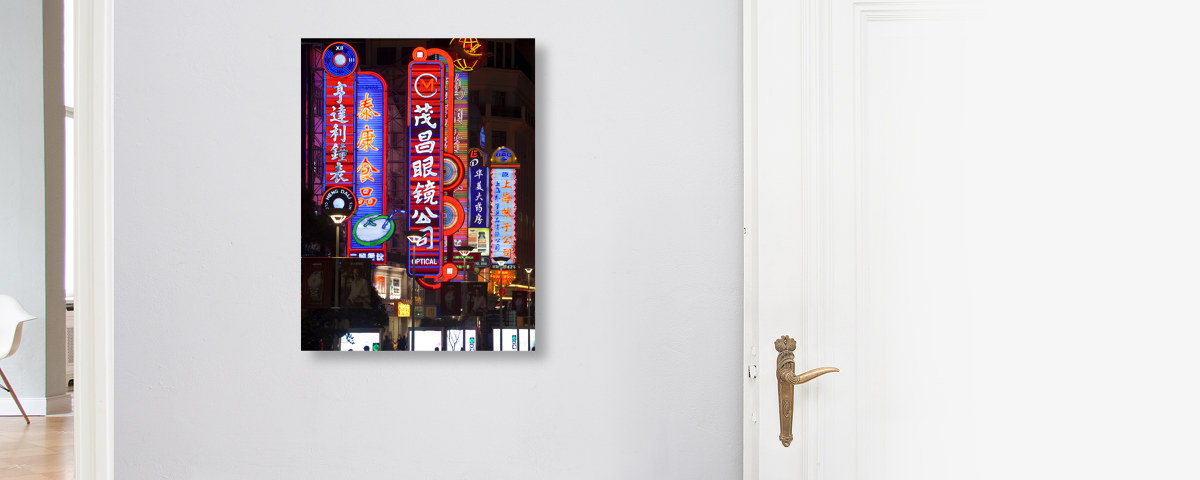 Neon Signs above Shops auf Leinwand im Format Ihrer Wahl. Mit gespiegelten oder umgeschlagenem Rand bzw. der Randfarbe Ihrer Wahl. Mit 2,5 oder 3,8 cm starken Perfect Frame Rahmen.
