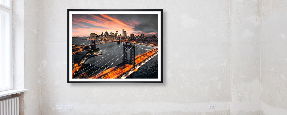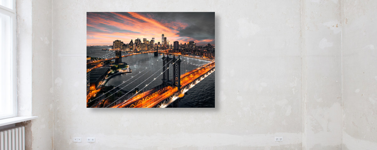 MANHATTAN PANORAMA als Hahnemühle Fineart Print. Entweder pur als Print, im Rahmen auch mit Passepartout oder kaschiert auf Alu-Dibond. Das handgeschöpfte Papier zeigt Nuancen Ihres neuen Lieblingsbilds, die auf anderen Materialien im Verborgenen bleiben.