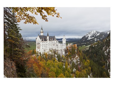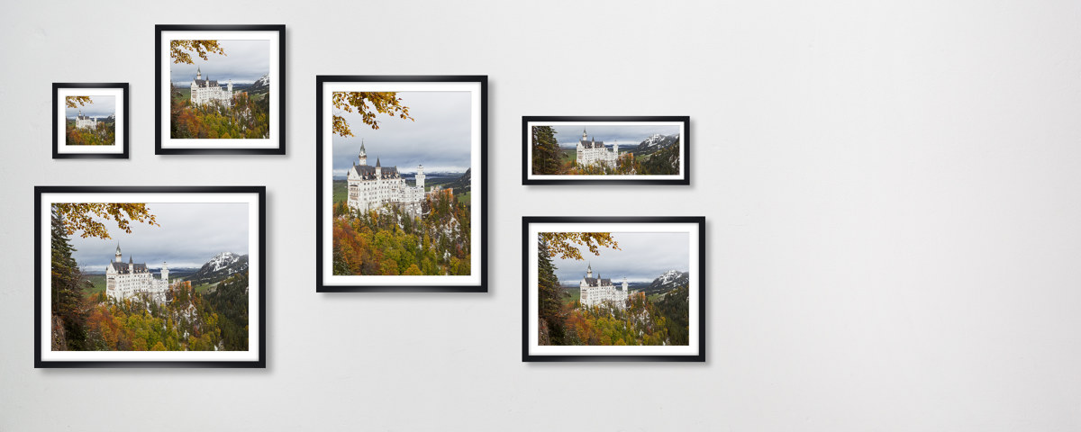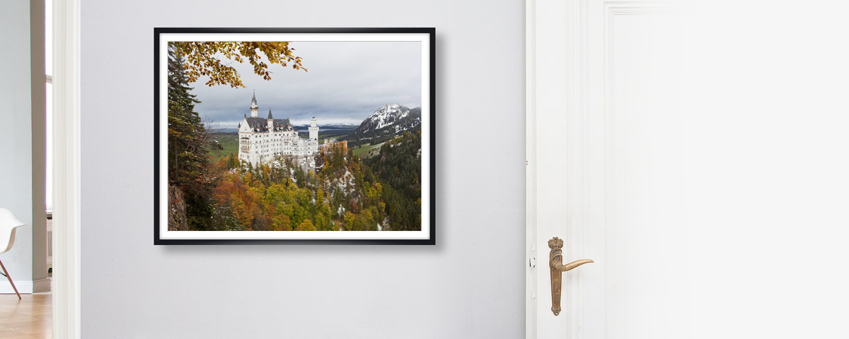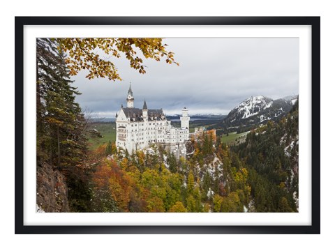 Schloss Neuschwanstein im weißen Holzrahmen. Setzen Sie Ihr neues Lieblingsmotiv dezent in Szene - wahlweise mit und ohne Passepartout.