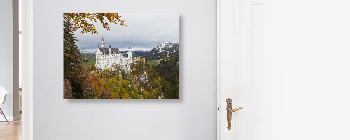 Schloss Neuschwanstein auf Leinwand im Format Ihrer Wahl. Mit gespiegelten oder umgeschlagenem Rand bzw. der Randfarbe Ihrer Wahl. Mit 2,5 oder 3,8 cm starken Perfect Frame Rahmen.