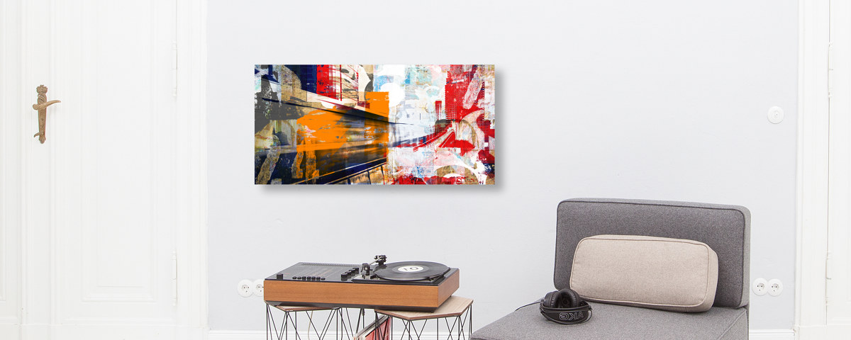 Urbanes Abstraktes auf Leinwand im Format Ihrer Wahl. Mit gespiegelten oder umgeschlagenem Rand bzw. der Randfarbe Ihrer Wahl. Mit 2,5 oder 3,8 cm starken Perfect Frame Rahmen.