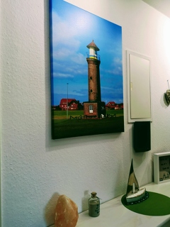 Wir haben uns Lieblingsmotiv, den Leuchtturm von der schönen Insel Juist, auf Leinwand verewigt. Das Bild passt wunderbar in unseren Themenflur Nordsee. Alles mit unseren eigenen Fotos dekoriert.
